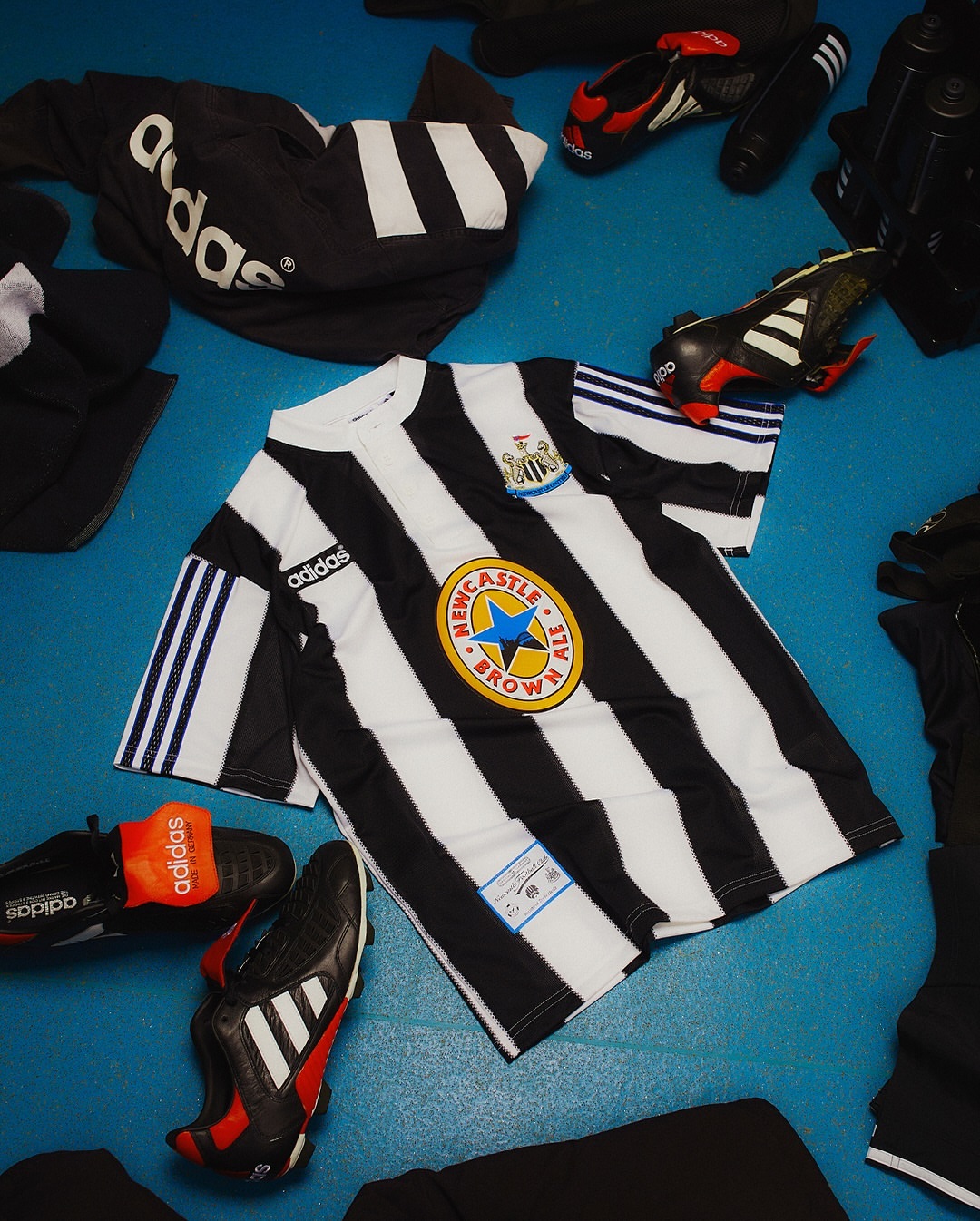 The Magpies’ iconic home shirt’s Henley button-down collar to its Jock Tag label is a hallmark of Premier League heritage. And the upcoming reproduction is a faithful replica courtesy of its original adidas logo and Newcastle Brown Ale sponsor.