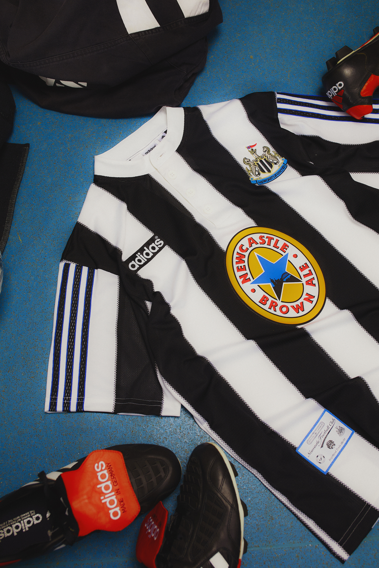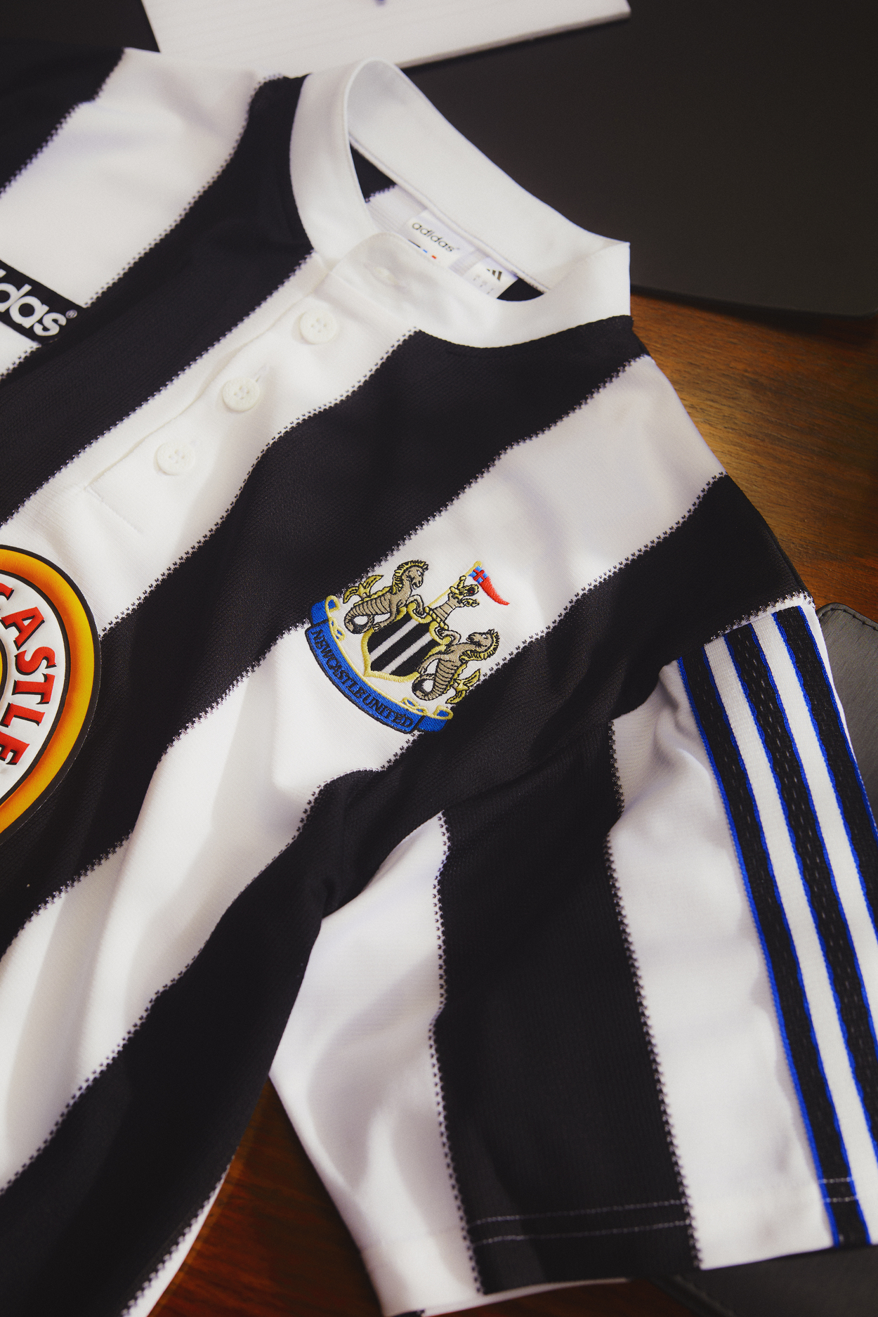The Magpies’ iconic home shirt’s Henley button-down collar to its Jock Tag label is a hallmark of Premier League heritage. And the upcoming reproduction is a faithful replica courtesy of its original adidas logo and Newcastle Brown Ale sponsor.
