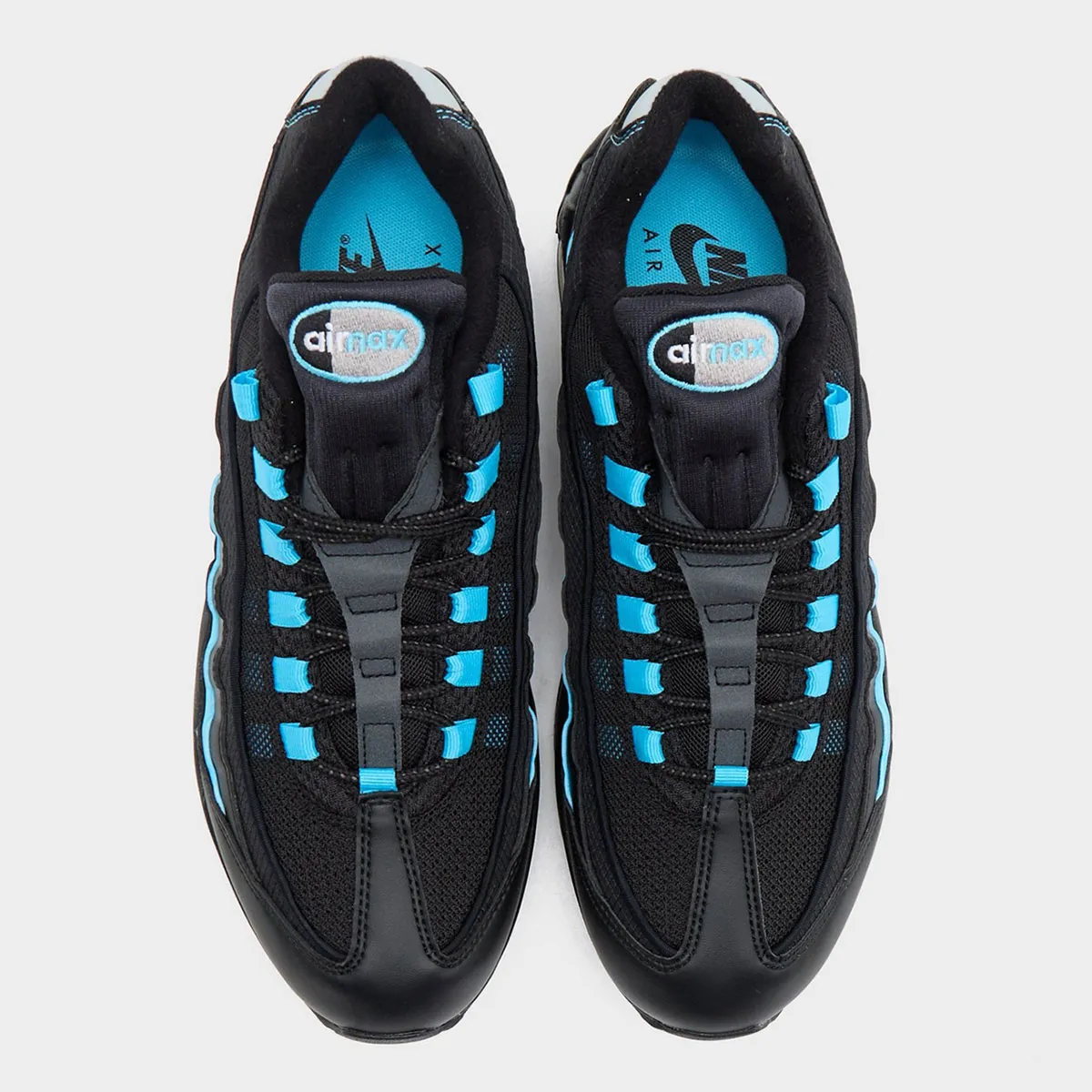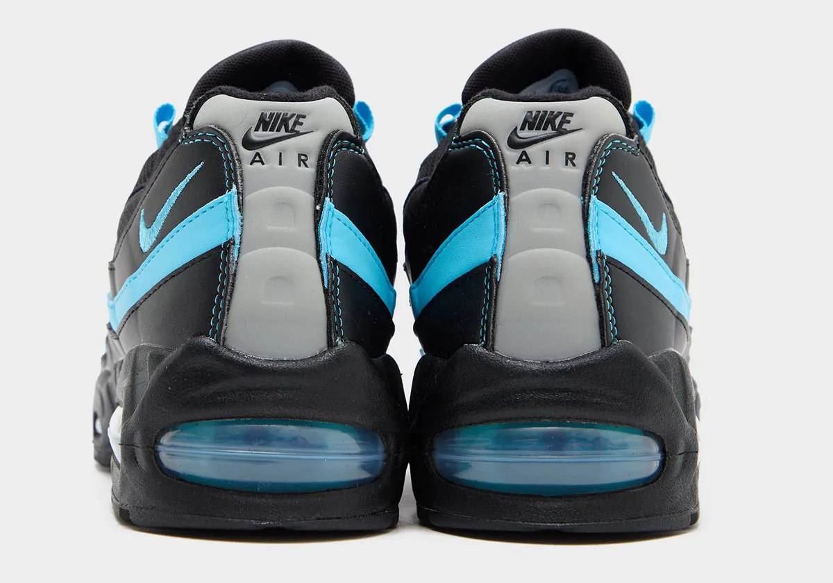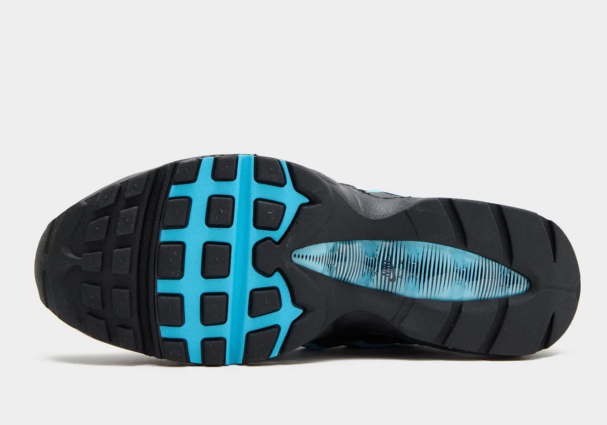 Though there’s already been an identically titled Air Max 95 of some repute, rather than playing off of the “Neon” arrangement like that pair does, here the Nike team uses the titular cerulean to strike through what’s essentially a “Triple Black” arrangement. The biggest impact comes with the middlemost “wave” on the sidewalls, but contrast embroidery, branding, eye-stays, and Air bubbles make their mark as well. For one final point of intrigue, the “bubble seam” is included for adult pairs (retailer images below) and removed for GS sizing (official Nike shots). It’s an intriguing wrinkle to track chiefly because other kids’ editions have sported the OG specs — perhaps something to look for if you’re particular about the new generation representing OG specs.