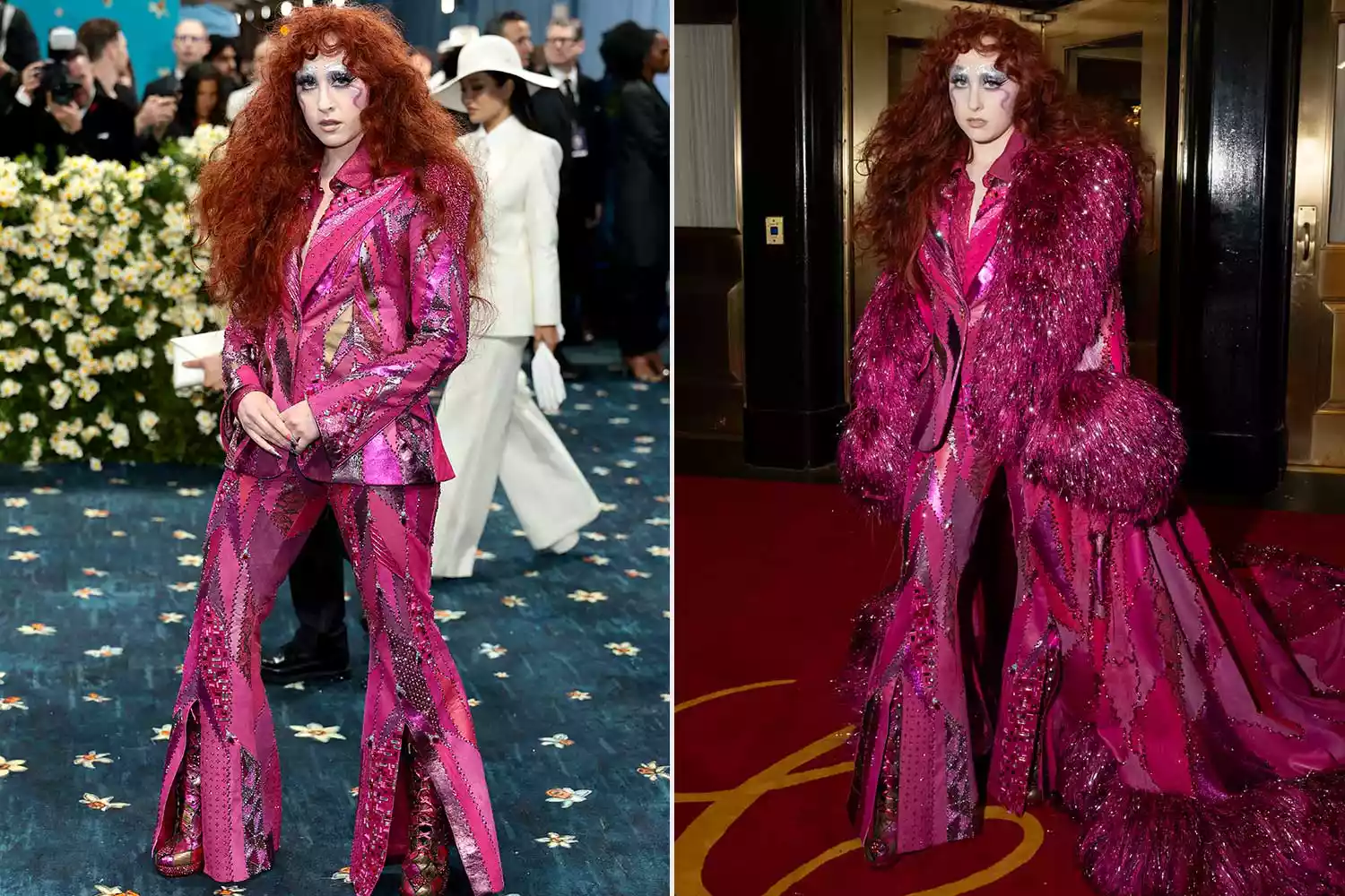 She was photographed wearing an enormous patterned hot pink cape complete with a train decked out in magenta tinsel earlier in the night on May 5.