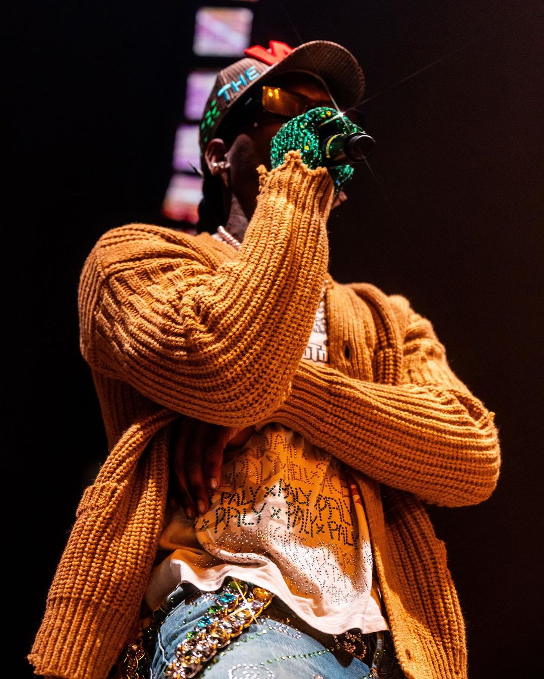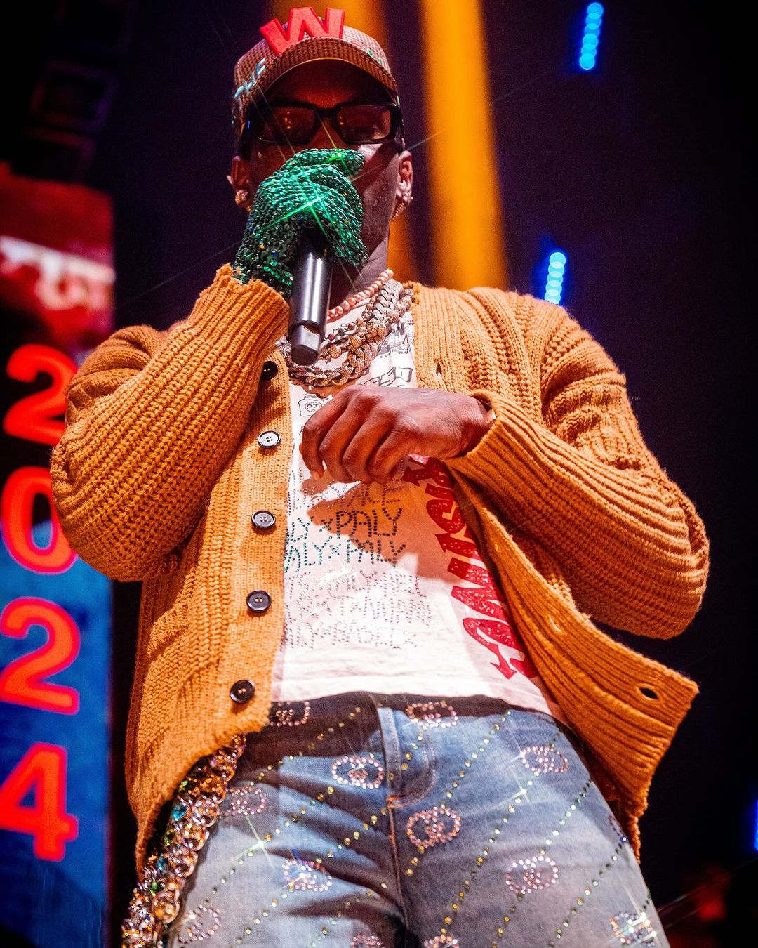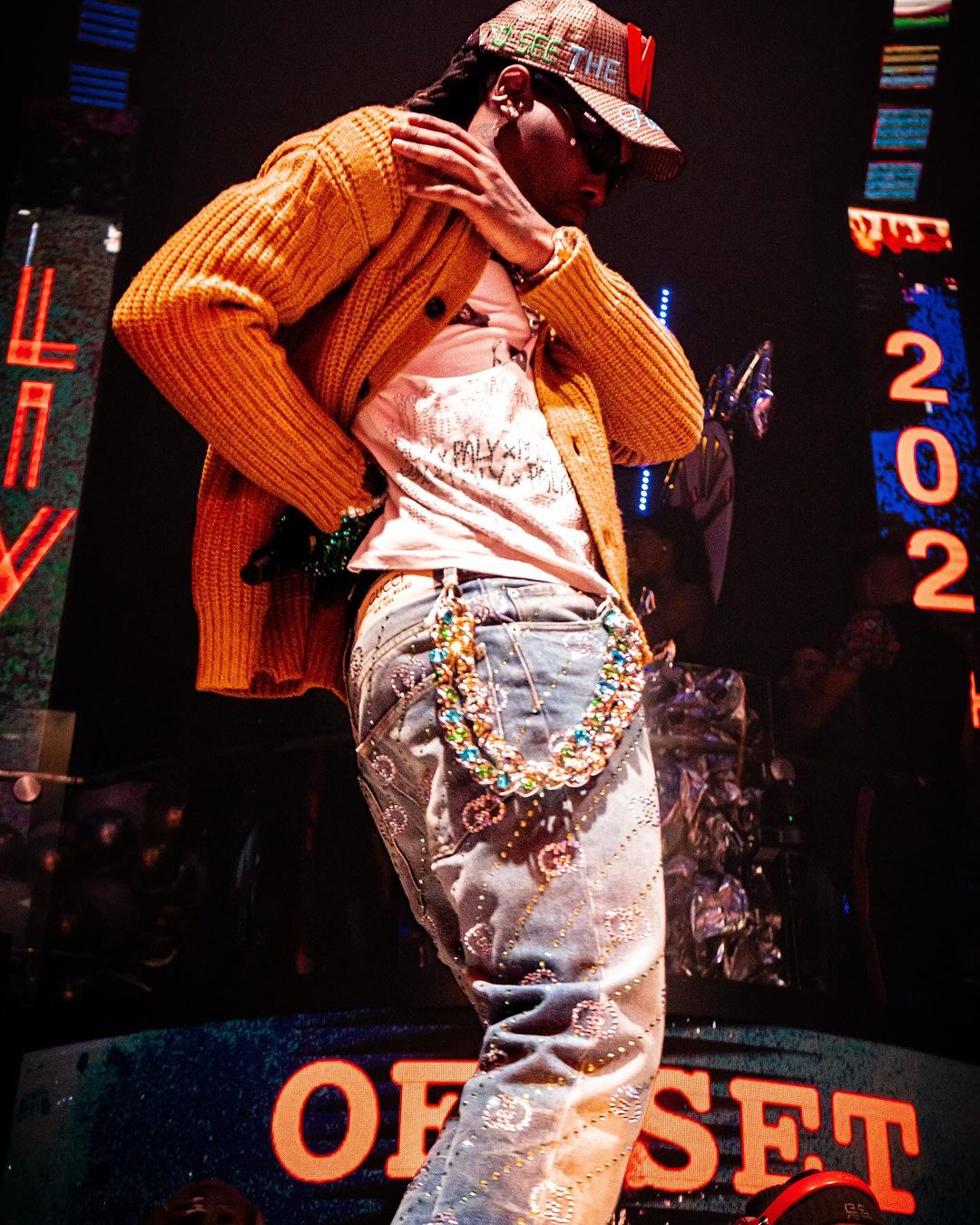 Welcoming in the new year with one of his most textured ensembles yet, Offset took to the stage to perform some of his latest music, which has been steadily climbing the charts. For this strictly luxurious look, the veteran rapper opted for a vintage white bejeweled t-shirt, a mustard yellow cable-knit jumper, as well as a host of jewelry – including a standout aqua blue waist chain. Getting into the brands, the 32-year-old musician rocked a Walter Van Beirendonck Future Jolly Cap, a pair of black Prada sunglasses, in addition to a set of green sequin gloves, and a pair of Gucci GG-embellished Straight-leg Jeans.