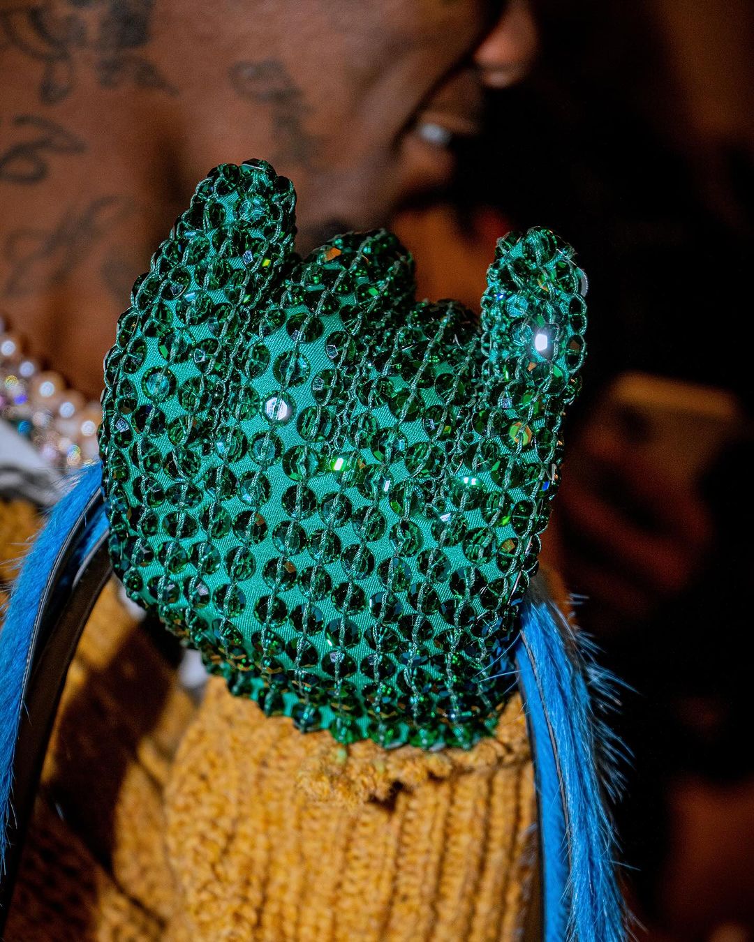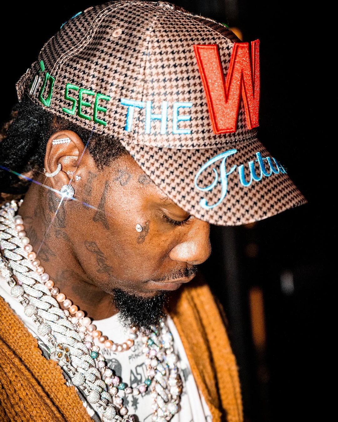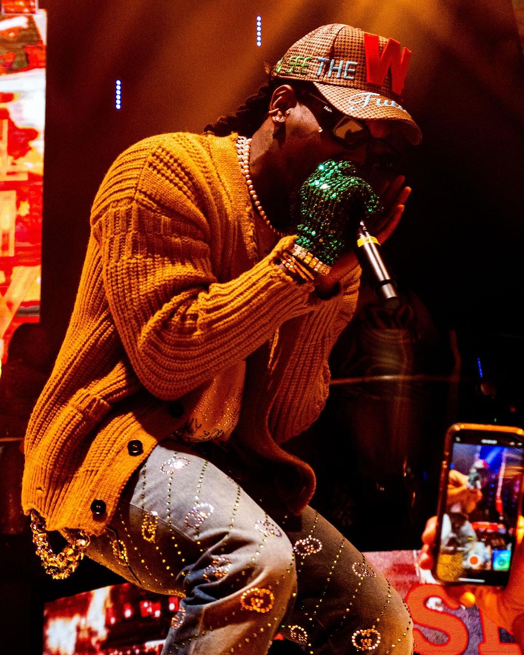 Welcoming in the new year with one of his most textured ensembles yet, Offset took to the stage to perform some of his latest music, which has been steadily climbing the charts. For this strictly luxurious look, the veteran rapper opted for a vintage white bejeweled t-shirt, a mustard yellow cable-knit jumper, as well as a host of jewelry – including a standout aqua blue waist chain. Getting into the brands, the 32-year-old musician rocked a Walter Van Beirendonck Future Jolly Cap, a pair of black Prada sunglasses, in addition to a set of green sequin gloves, and a pair of Gucci GG-embellished Straight-leg Jeans.