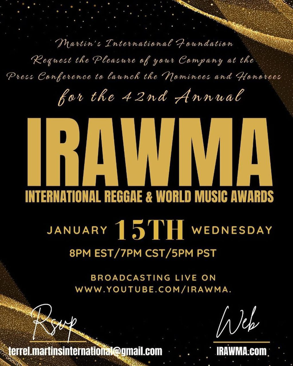The International Reggae & World Music Awards (IRAWMA) will unveil its 2025 nominees through a live YouTube broadcast on January 15, 2025.