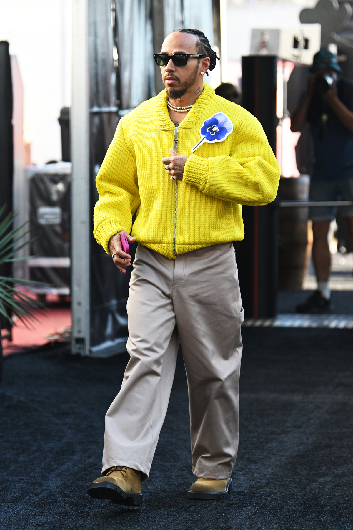 Arriving in a vibrant canary yellow cable-knit zip-up cardigan, Hamilton proved his fashion prowess yet again, pairing the statement piece with Marc Jacobs’ signature attention to detail. The cardigan, featuring a striking blue poppy motif on the chest, perfectly balanced the boldness of his top with oversized beige cargo trousers and sleek, suede brown boots for a laid-back, yet luxe finish.