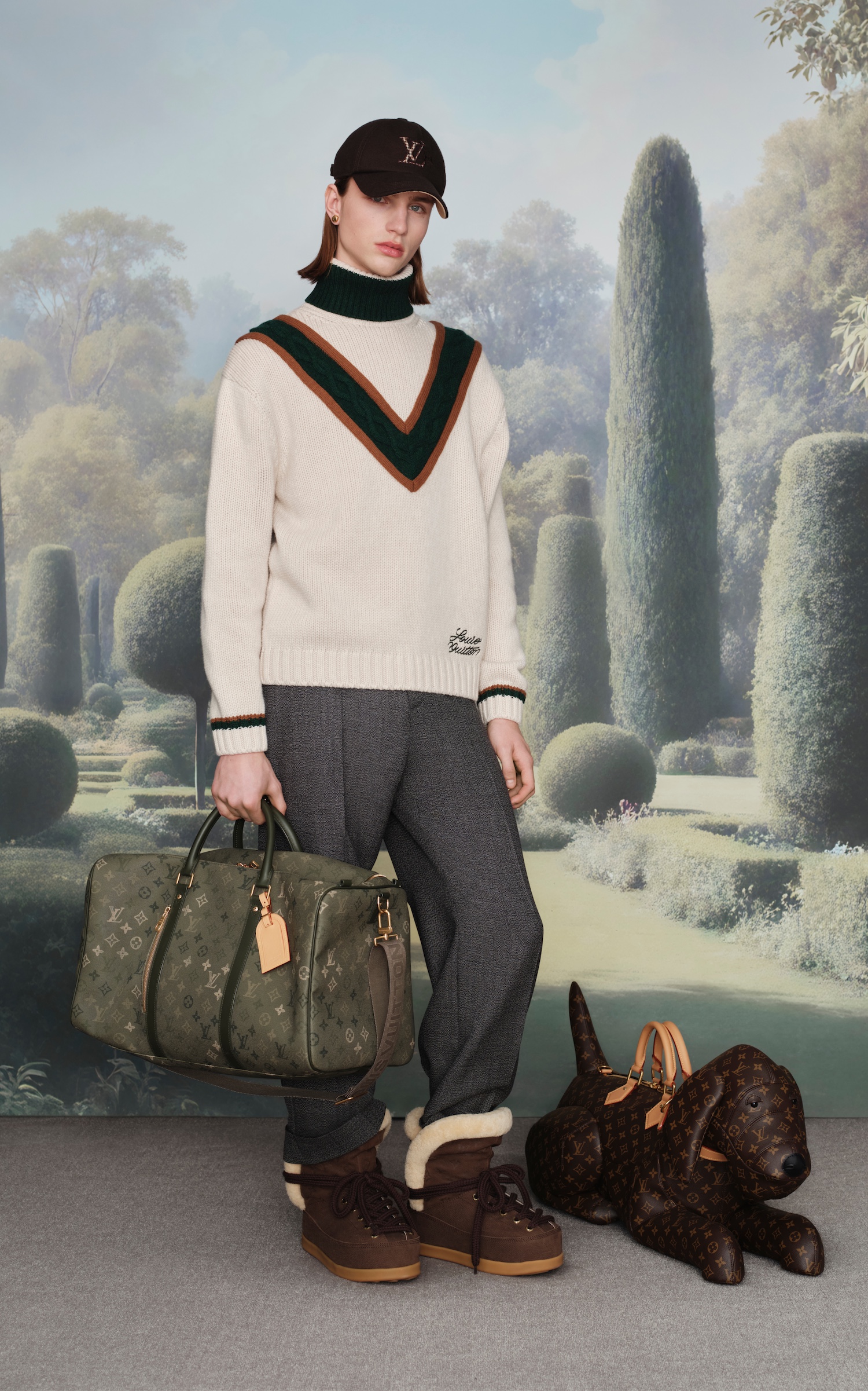 Four main motifs—Monogram Surplus, Monogram Waterdrops, Countryside Dandy, and LV Blason Animals—evoke the essence of the outdoors through fine detailing and distinctive fauna, while a palette of earthy browns, mossy greens, and gentle blue-greys depicts Britain’s always shifting landscapes.
