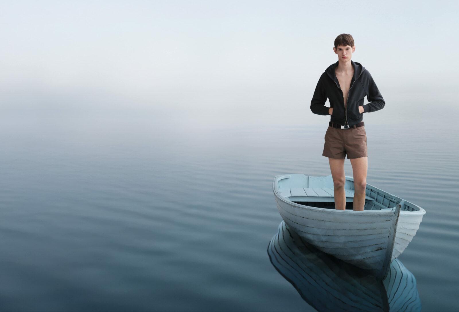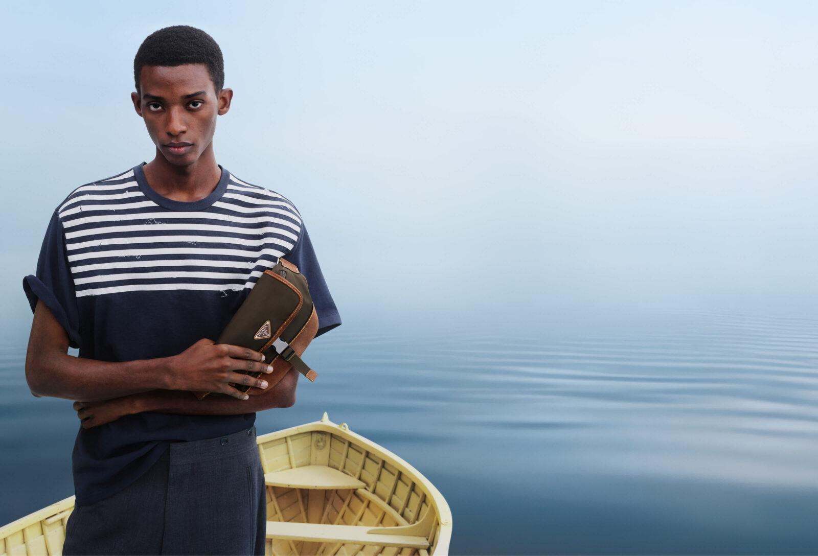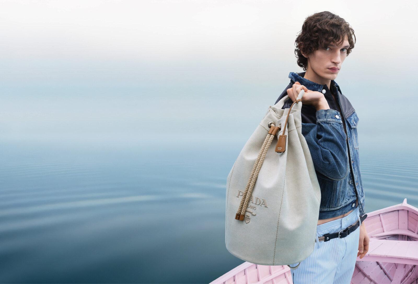 While Kendall Jenner is seen carrying the latest iteration of the iconic Galleria bag, presented in a striking cow print colorway, Hunter Schafer effortlessly models the Buckle Leather Bucket Bag. On the other hand, Troye Sivan highlights the sleek and modern Mariner Re-Nylon Bucket bag. Structured tailoring, softened by breezy silhouettes, and crisp whites bathed in sun-bleached pastels create a language that speaks of both urban sophistication and coastal ease. Very Prada.