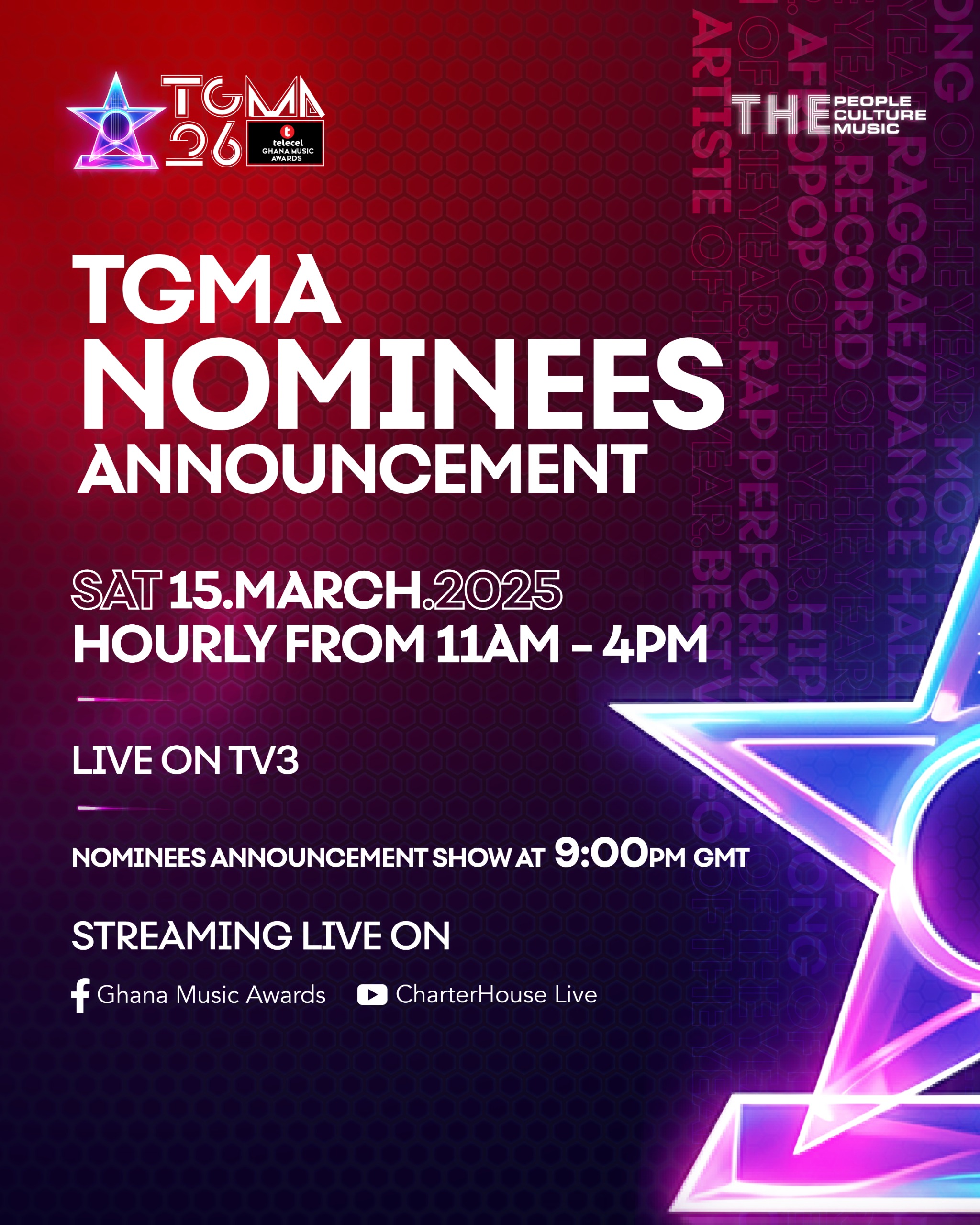 The wait is almost over. Saturday, 15th March will be a day to remember as the 26th Telecel Ghana Music Awards finally reveals its nominees. With Ghana’s top artists and groups battling it out for the prestigious honors, the anticipation is at an all-time high. As the music industry continues to evolve, the TGMA remains a true benchmark of excellence. Be sure to tune in to TV3 on 15th March as the curtain rises on this year’s nominees and the countdown to an unforgettable awards show begins.